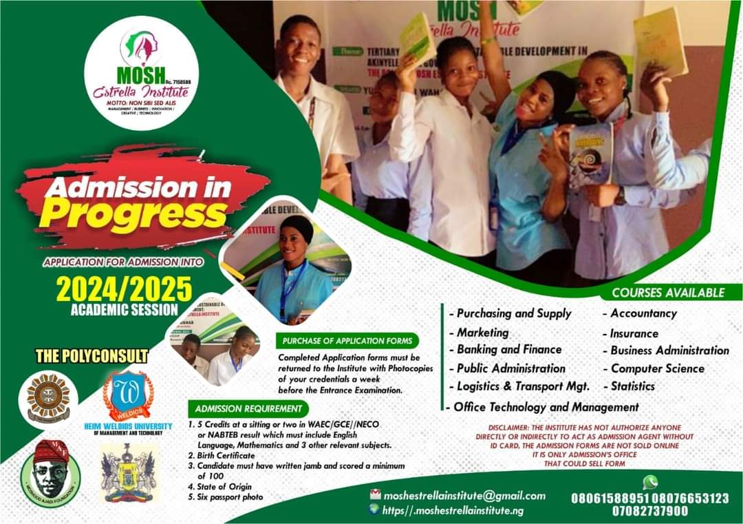 Are you tired of staying at home or worried about which institution you should join for the next academic session. Think no more admission is currently on going at MOSH Estrella Institute for 2024/2025 academic session. Utilize this opportunity to study the course of your choice alongside our season and experienced lecturers.