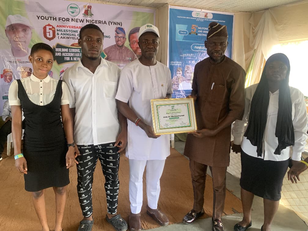 Akinyele, Oyo State. The Youth for New Nigeria (YNN), Akinyele Chapter, has honoured Amb. Dr. Otunba Moshood Ismail Abioye (Dr. Mosh) with a Meritorious Award at its 5th Anniversary Milestone Celebration and Annual General Meeting, held over the weekend.